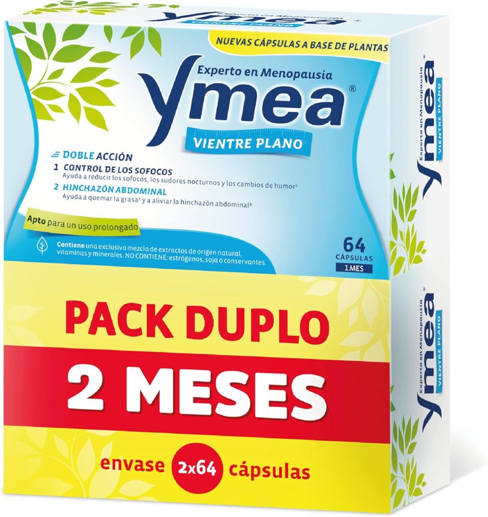 Ymea Menopausa Barriga plana, sufocos e inchaço, tratamento de 2 meses, conjunto duplo de 2 x 64 cápsulas