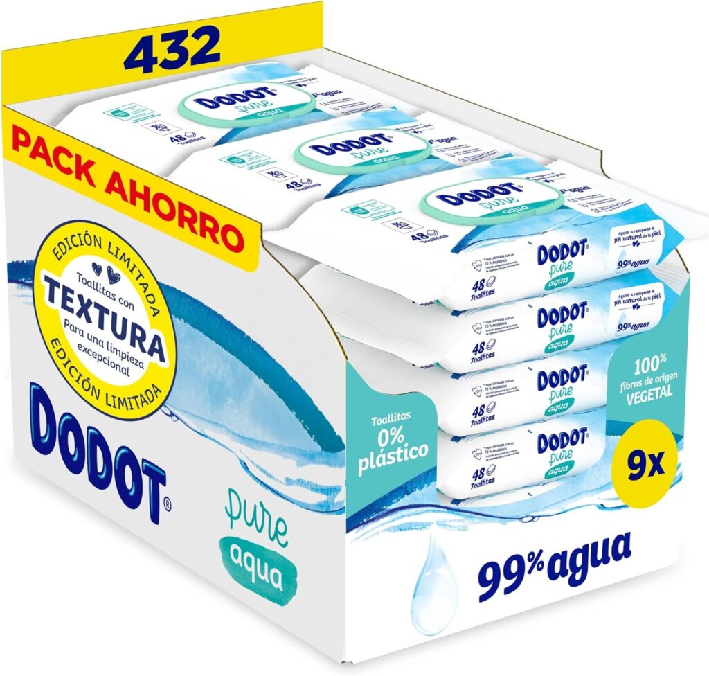 Dodot Toalhetes Pure Aqua para bebé, 432 toalhetes (9 pacotes de 48 unidades), ajudam a restaurar o PH natural da pele, 99% água, sem plástico